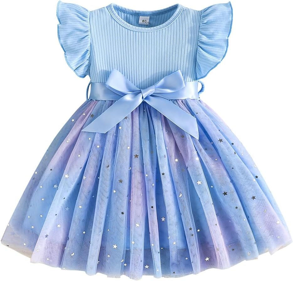 PythJooh Baby Girl Dresses Ruffle Sleeve Rib Cotton Dress Girls Silver Stars Mo