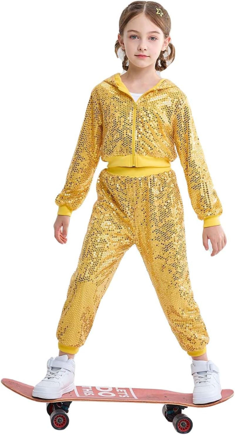 LOLANTA 2PCS Kids Sequins Hip Hop Dance Costume Street Dancewear Long Sleeve Ho