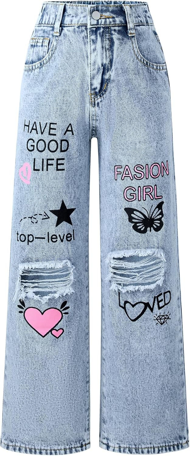 FEOYA Kids Girls Jeans Pants Wide Leg Printed Casual Bootcut Denim Trousers Ela