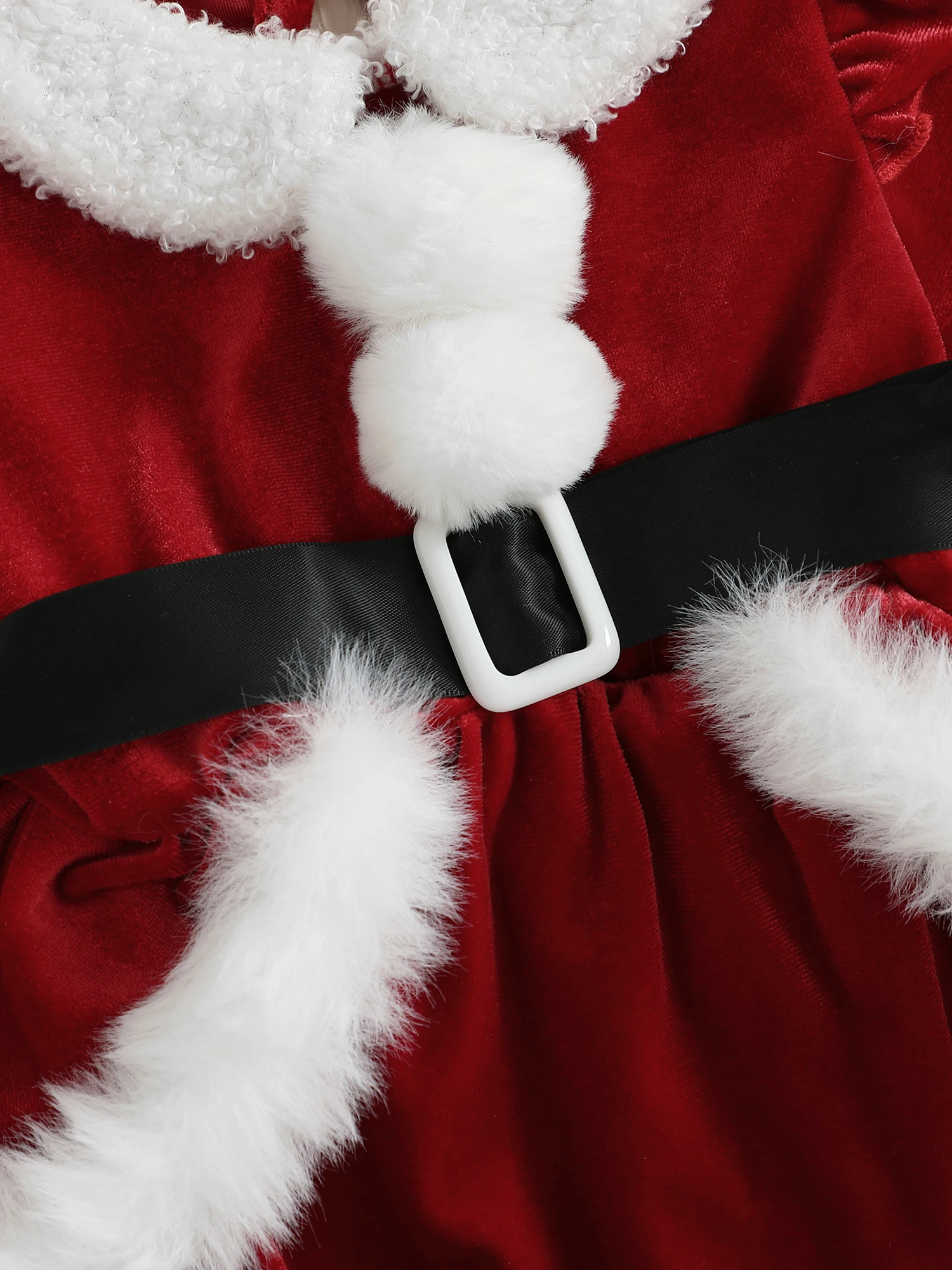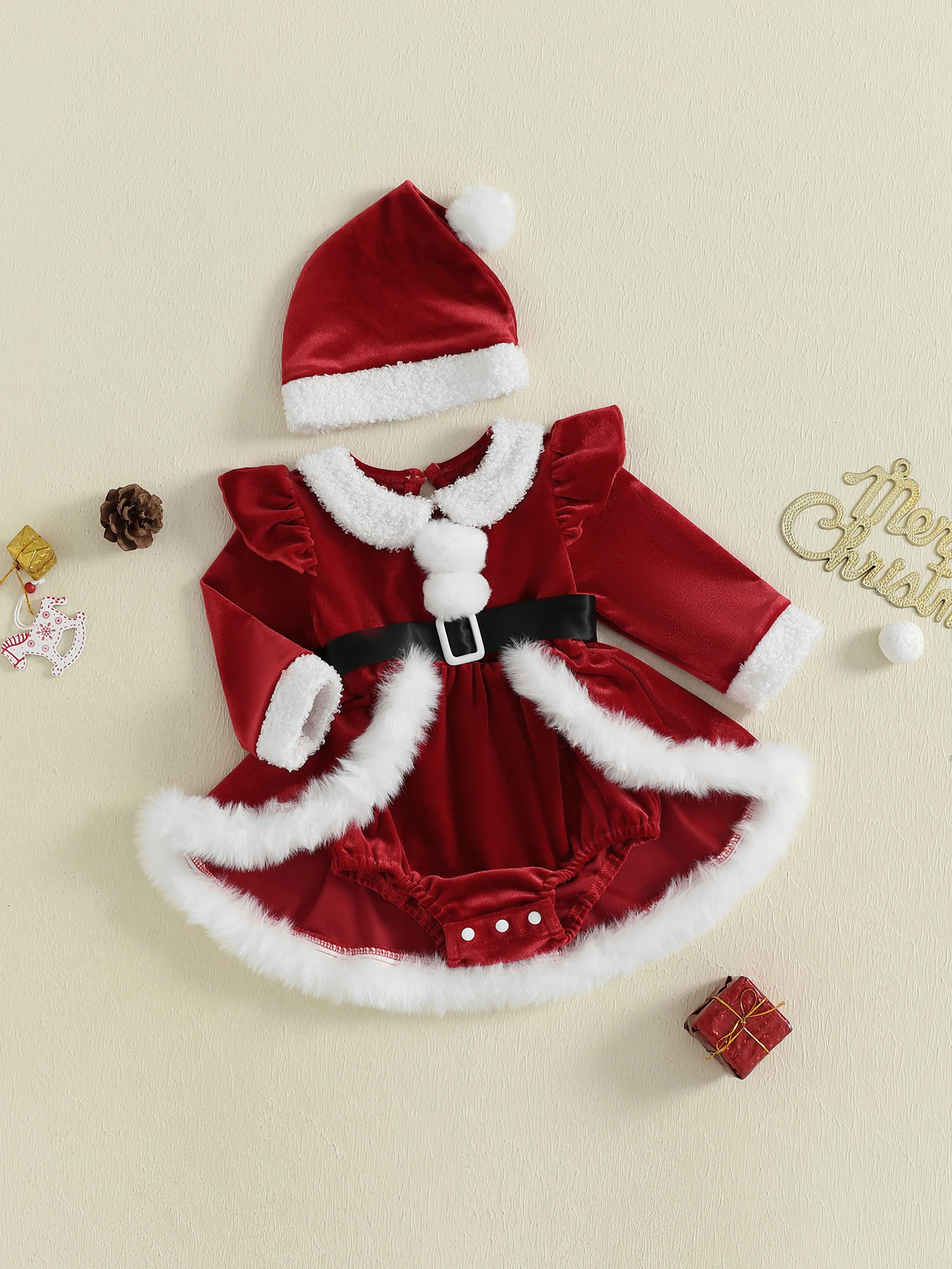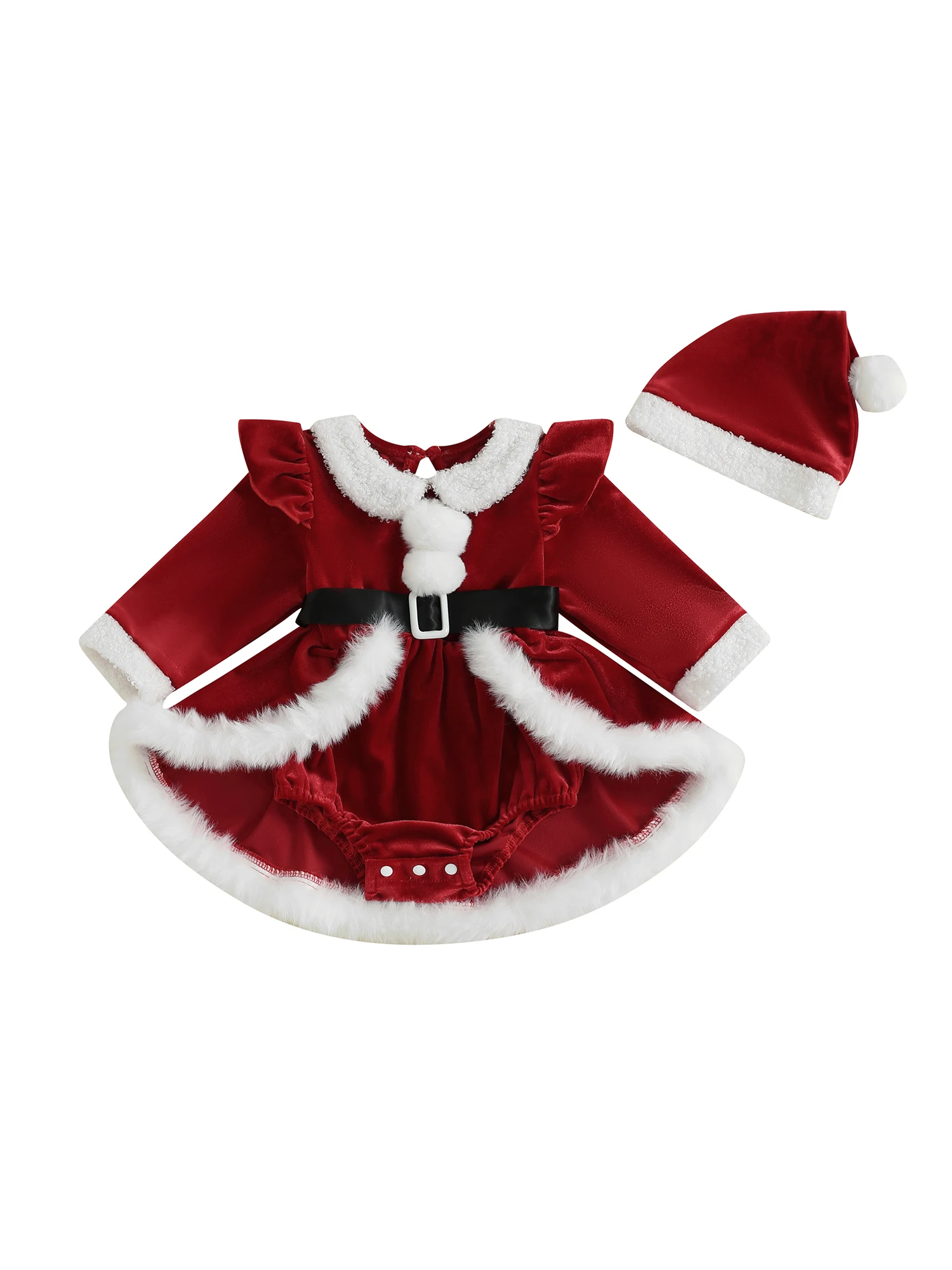 Christmas baby clothes; Baby girl romper dress; Toddler long sleeve romper, plush patchwork, ruffles, long sleeves, round neck with belt, crotch buttons; And cute santa hat set, simple but fashionable, make your baby more adorable